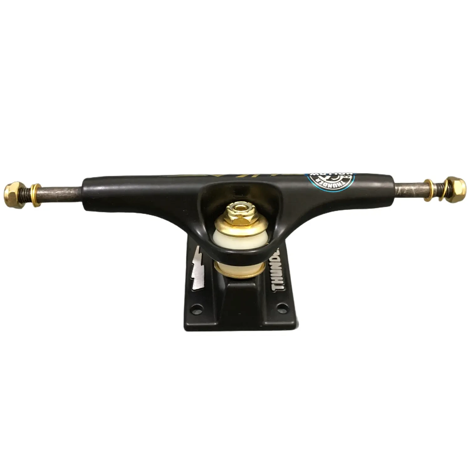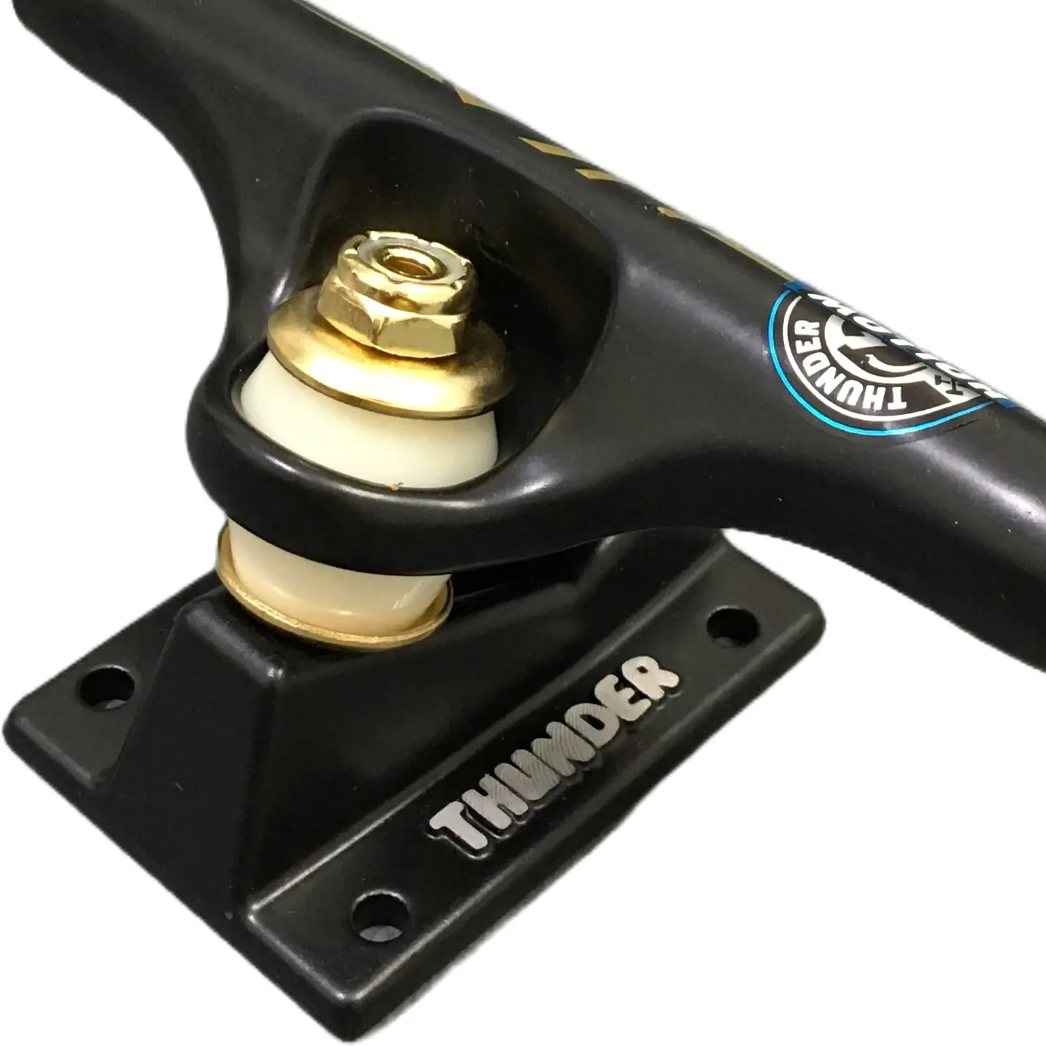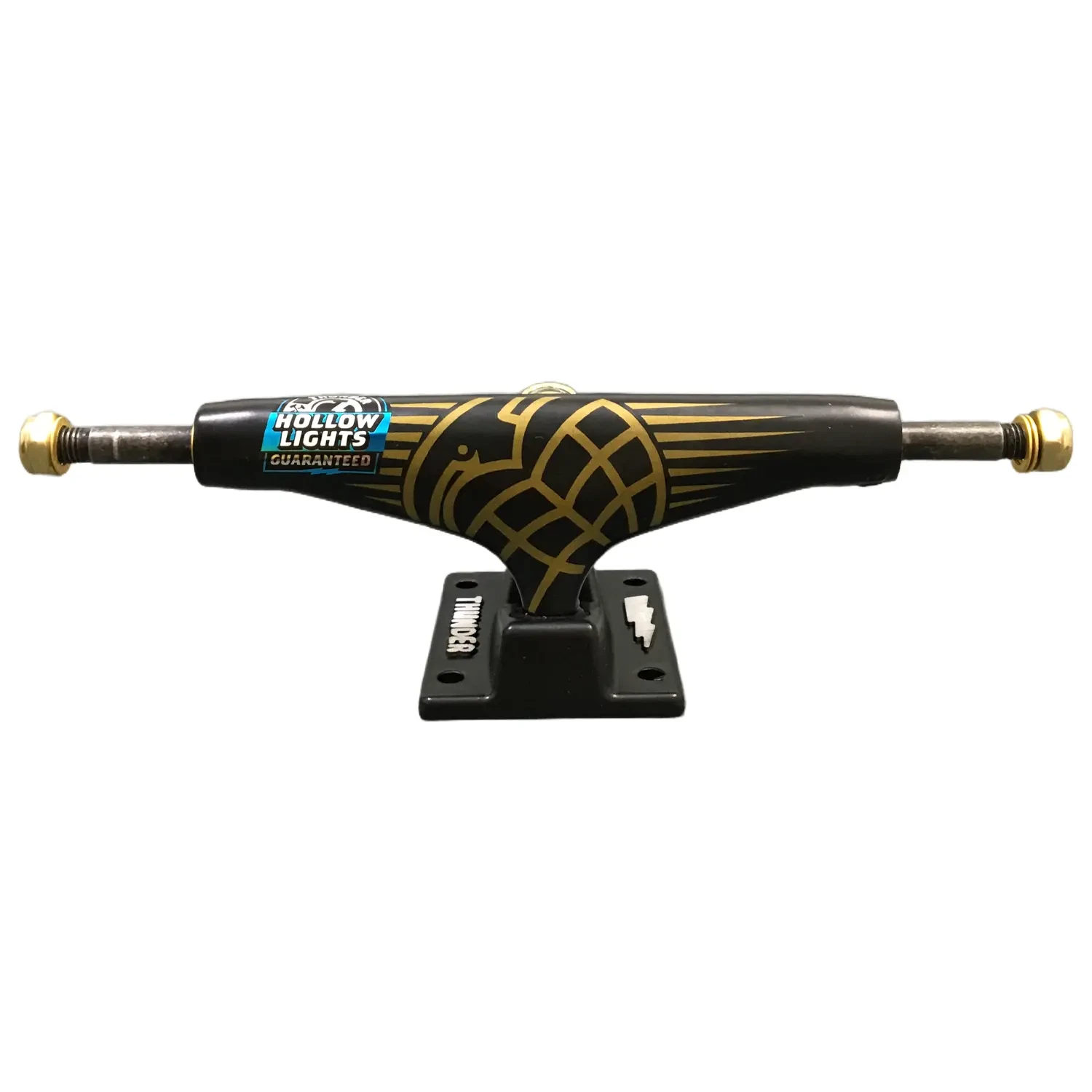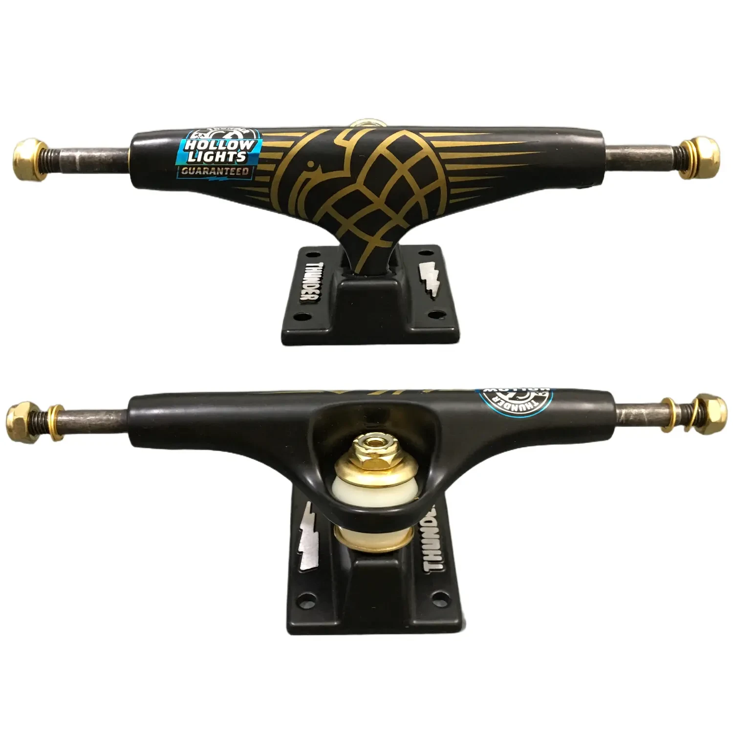تراکهای اسکیتبرد Thunderمدل Hollow Lights، طرح حرفهای Night II با رنگ مشکی طلایی، دارای محور و کینگپین توخالی با پایههای فورج شده. طراحی شده برای سرعت بیشتر، وزن کمتر و کنترل فوقالعاده در حرکات.