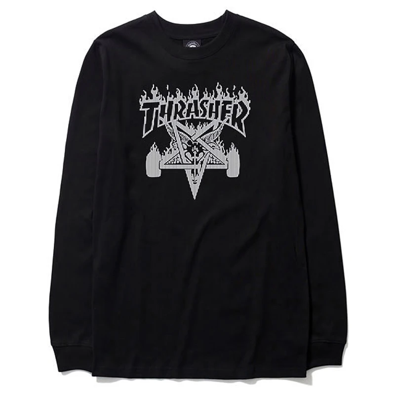 تیشرت آستین بلند مشکی Thrasher با طرح Skate Goat Pentagram، جنس نخی درجهیک، چاپ ماندگار و مناسب استایل خیابانی و اسکیتی. تنخور راحت و مناسب روزهای خنک در فصلهای پاییز و زمستان.